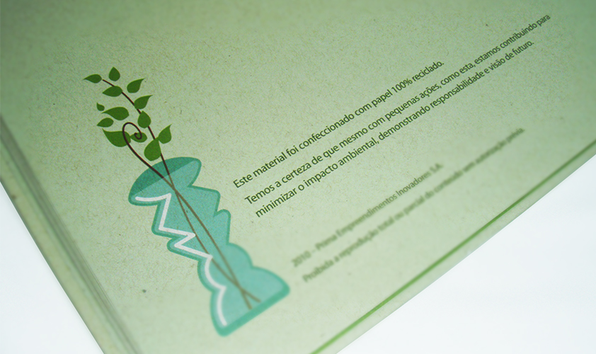 Um dos principais cuidados foi na escolha da gráfica para produção do material, realizada por uma empresa certificada com o selo FSC. O FSC exige controle de emissão de efluentes, preservação da fauna e flora nativa, não deixando de lado os direitos e interesses dos trabalhadores e da comunidade do entorno fabricante, portanto, ao utilizar papéis e produtos certificados pelo FSC, o consumidor contribui para um mundo mais sustentável.